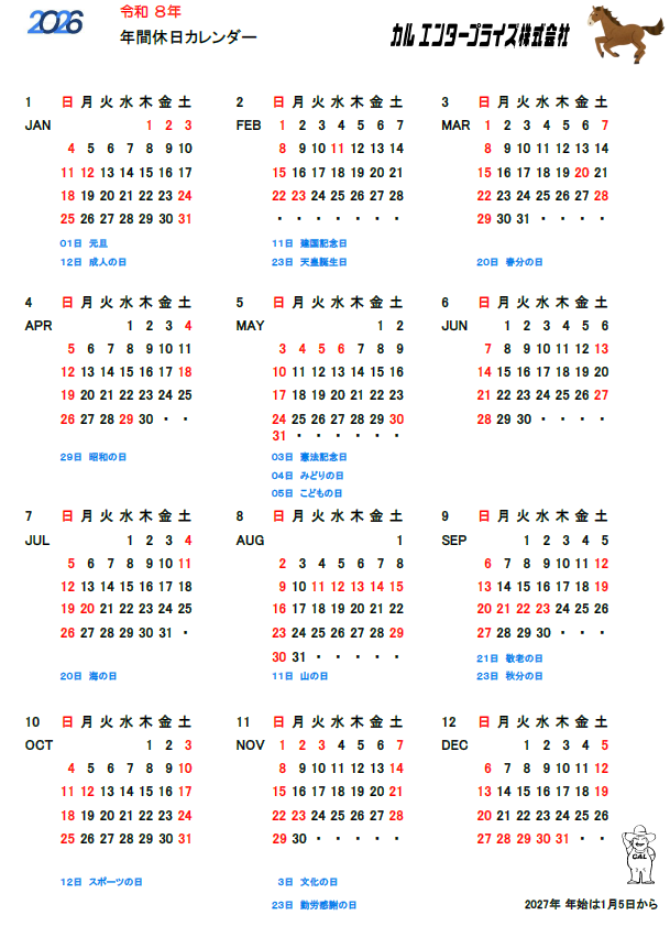弊社の2026年度の営業日および休業日をまとめたカレンダーを公開いたします。